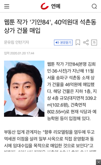 웹툰 작가 '기안84', 40억원대 석촌동 상가 건물 매입 - 조선일보 > 연예 > 연예 일반