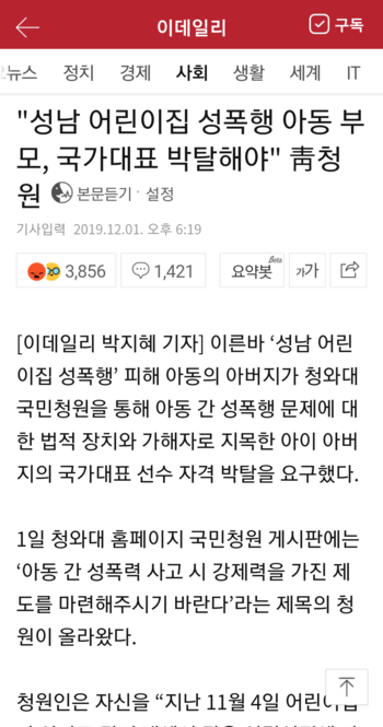 "성남 어린이집 성폭행 아동 부모, 국가대표 박탈해야" 靑청원