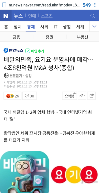배달의민족, 요기요 운영사에 매각…4조8천억원 M&A 성사(종합)